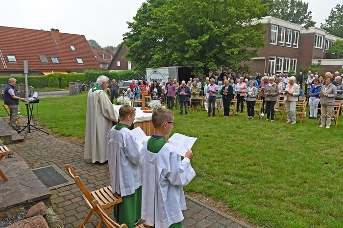 Der gemeinsame und vor der Corona Pandemie eigentlich traditionelle Feldgottesdienst der Gemeinden Herz-Jesu (Deuten), St. Barbara (Wulfen-Barkenberg) und St. Matthäus (Wulfen) hielt Pfarrer Martin Peters ab. Unterstützt wurde Pfarrer Peters dabei von Mitgliedern aus der Gemeinde. Gemeinsam mit den Gläubigen wurde für knapp eine Stunde gesungen und gebetet. Für viele Gäste hatten diese Feldgottesdienste immer eine ganz besondere Atmosphäre, da sich die Kirche hier auch mal außerhalb der Kirchenmauer zeigt. Deshalb waren viele Wulfener froh, dass es die Möglichkeit wieder bot. „Für mich war dieser Gottesdienste ein ganz besonderer. Es waren über 150 Teilnehmer da. Darüber habe ich mich sehr gefreut. Aufgrund von Corona hatten wir sogar an Ostern und Weihnachten weniger Gläubige in der Kirche. Deshalb bin ich froh und dankbar, dass das Wetter gut mitspielte und so viele Gemeindemitglieder gekommen sind“, resümierte Pfarrer Martin Peters. Einen besonderen Dank ging an den Heimatverein Wulfen, der als Gastgeber für eine perfekte Örtlichkeit sorgte.
