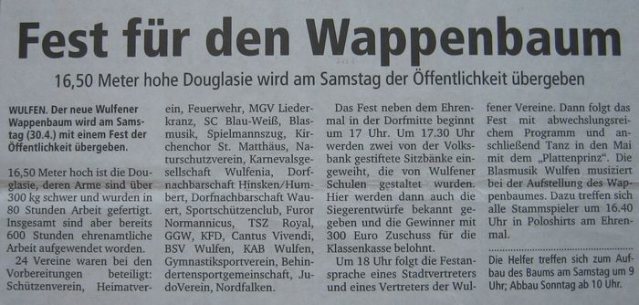 Baum voller Wappen steht – Wulfen hält zusammen und „pflanzt“ einen Baum By Lisa2. Mai 2011Presse Quelle: Dorstener Zeitung, 02.05.2011
